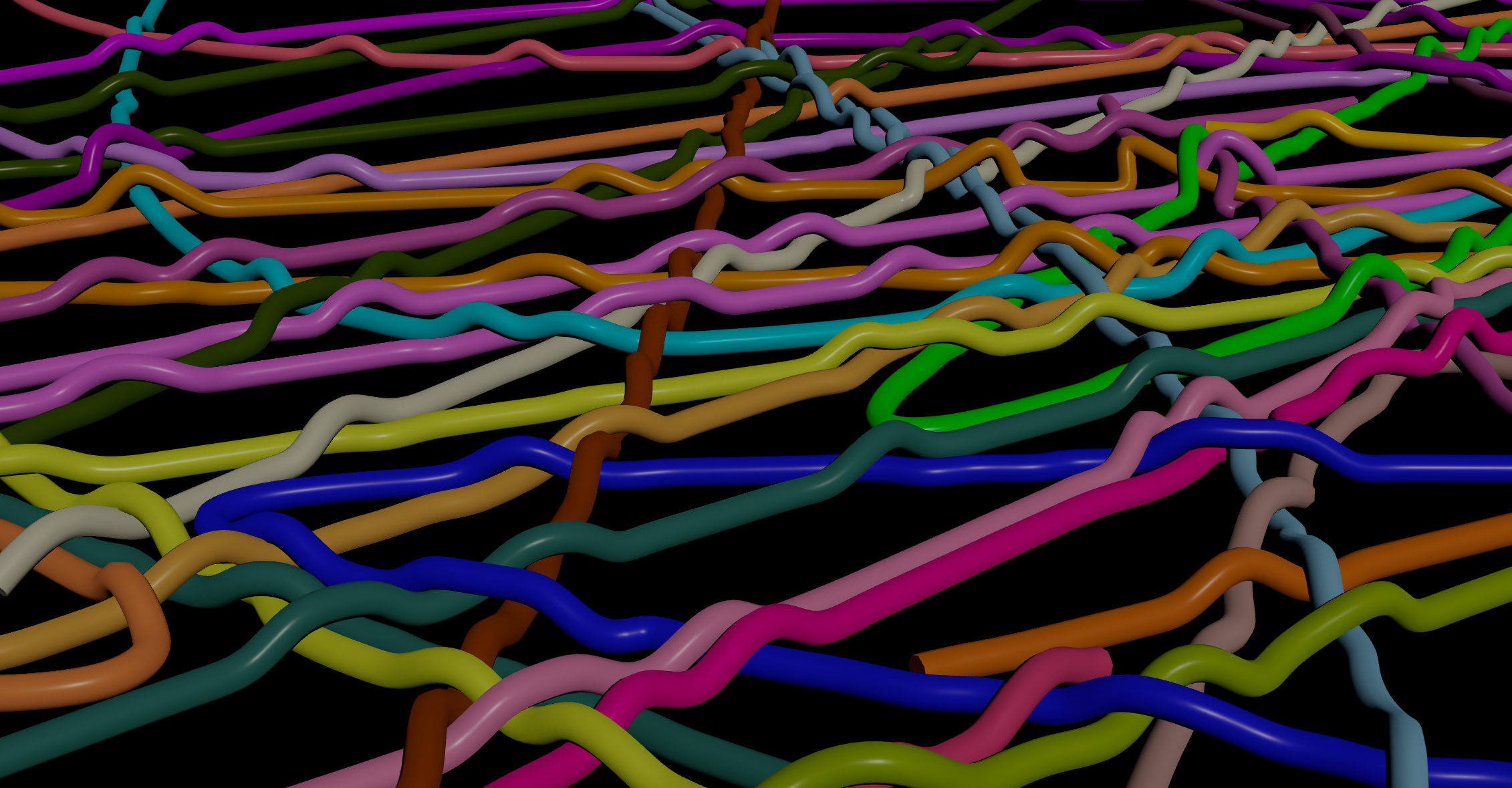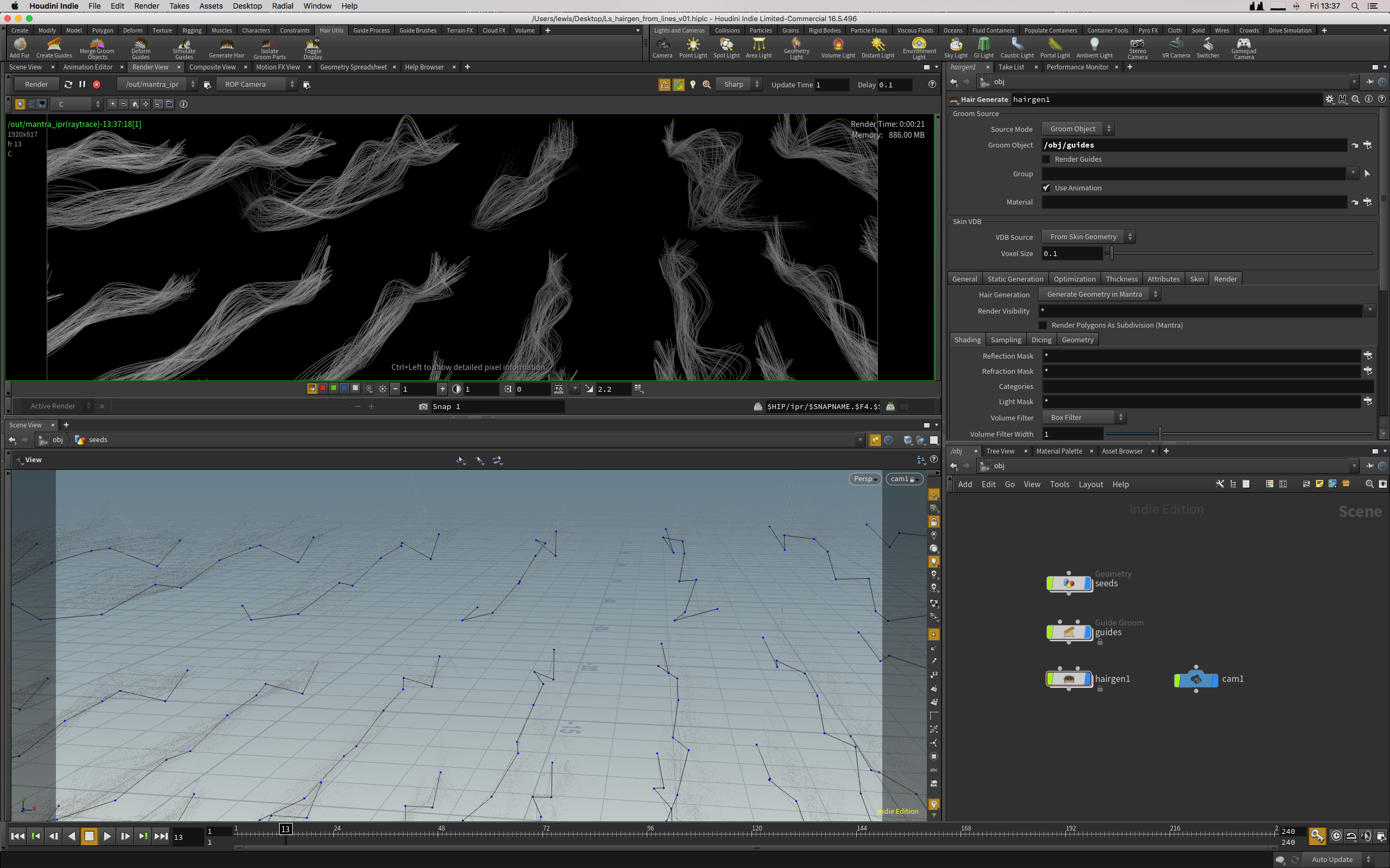 Using hairgen to create geo at render time from guide hairs which are just SOPs lines, with random variation done inside the hairgen.