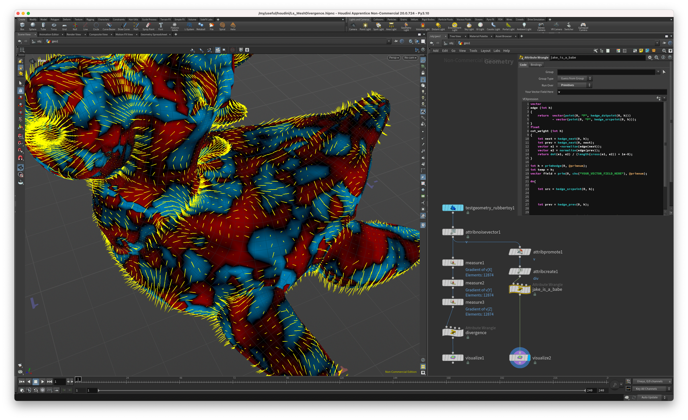 The Measure node can compute the gradient of an attribute, but the divergence of an attribute in cartesian coordinates is harder to compute. This file compares a rough estimation (the gradient sum) to Jake Rice’s method, which is more correct.