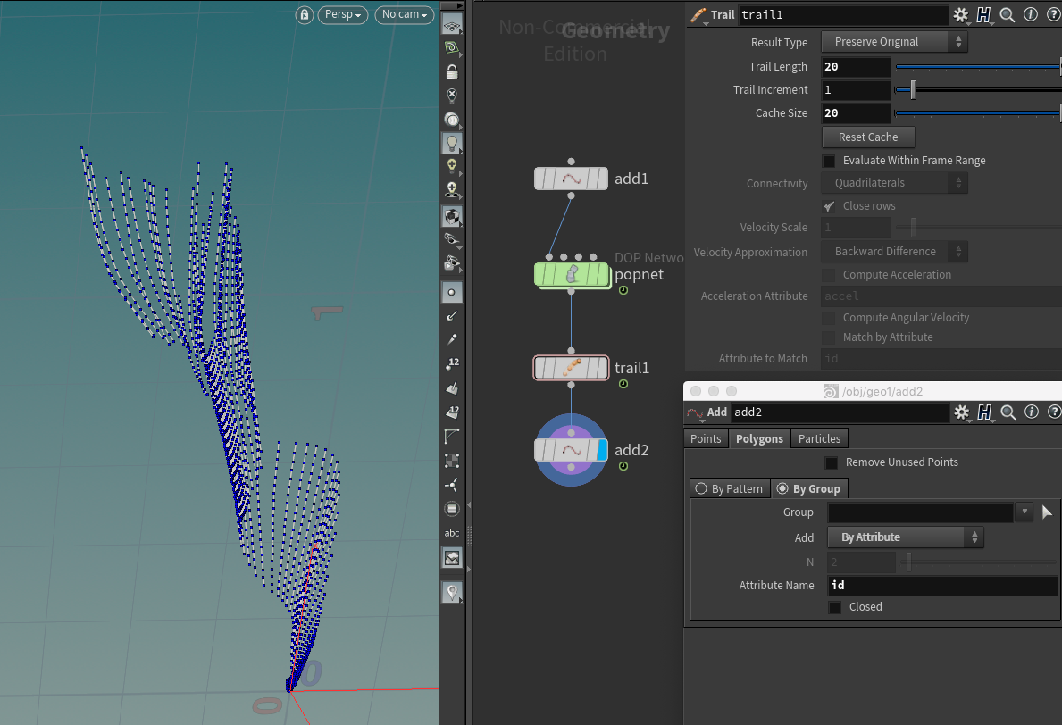 Basic particle trail using a Trail SOP followed by an Add SOP set to connect points with a matching ID attribute.