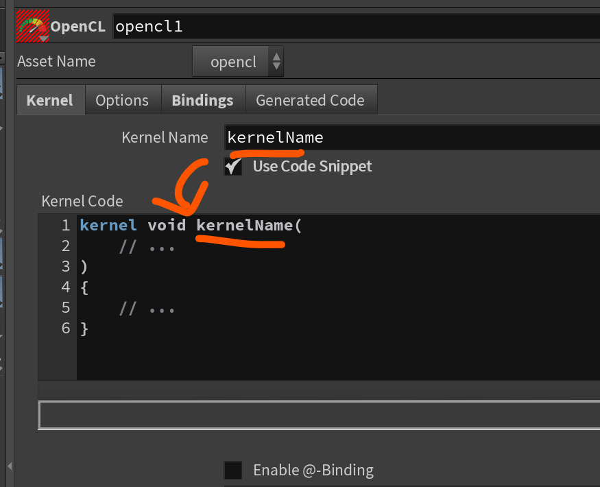 Each code snippet may contain multiple kernels. Houdini picks the one with the matching Kernel Name.