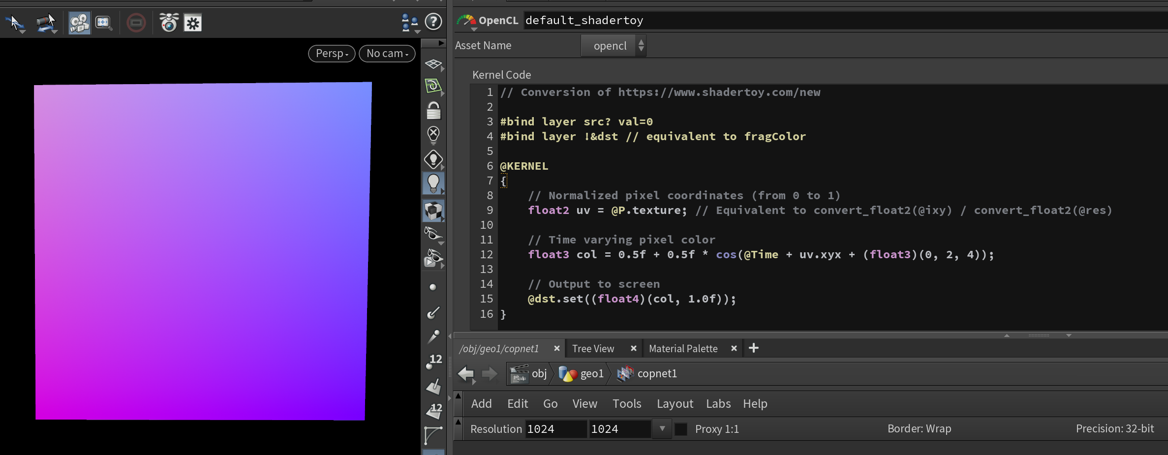 Block Begin and Block End nodes in Houdini.iChannel0 can be replaced with @src, or any other layer.texture(iChannel0, xy) must be replaced with @src.textureSample(xy)textureLod(iChannel0, xy, 0) doesn’t exist. It must also be replaced with @src.textureSample(xy)sampler2D are equivalent to reading a layer such as @src@Time, @Frame, @P, @ixy and @resfragCoord / iResolution.xy normalizes the position coordinate. This division simplifies to @P.texture, which has float2 type.iTime must be replaced with @Time. This has float type.iFrame must be replaced with @Frame. This has float type.@mouse binding:#bind parm mouse float3 val=0