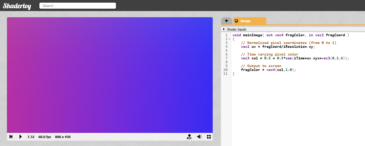iResolution is the size of the image in pixels. It must be replaced with @res, which has int2 type.@xres can be used to get the x coordinate only, same as @res.x@yres can be used to get the y coordinate only, same as @res.yfragColor is the output color. It must be replaced with @dst, which has float4 type when set to RGBA.fragColor = x must be replaced with @dst.set(x)#bind layer &!a // bind buffer A as writeable only