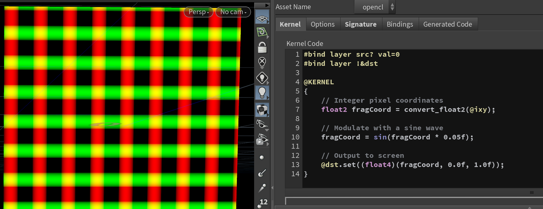 Each kernel has arguments passed to it based on the bindings in the “Bindings” tab.