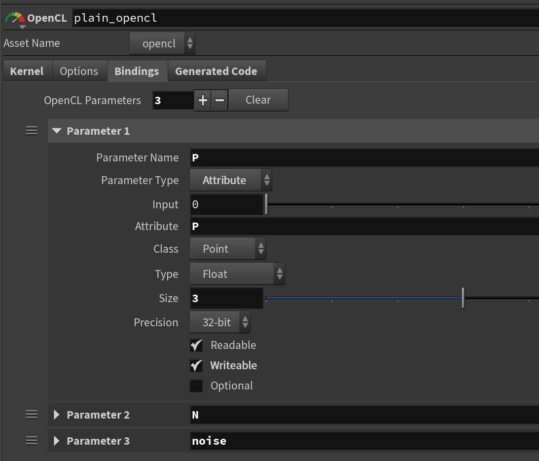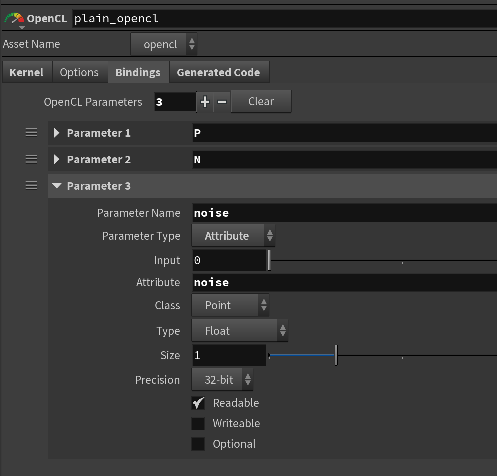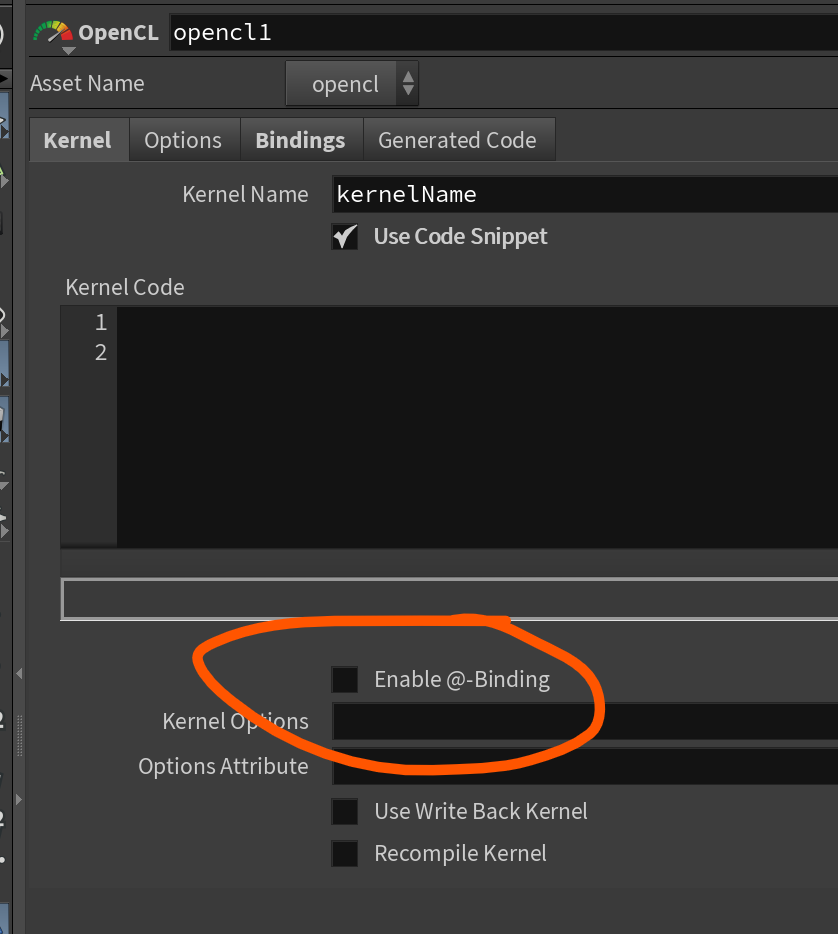 OpenCL doesn’t have this feature, we need to bind them manually. This is done in the “Bindings” tab.