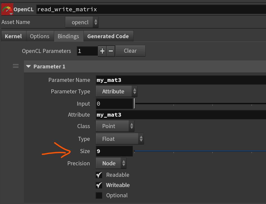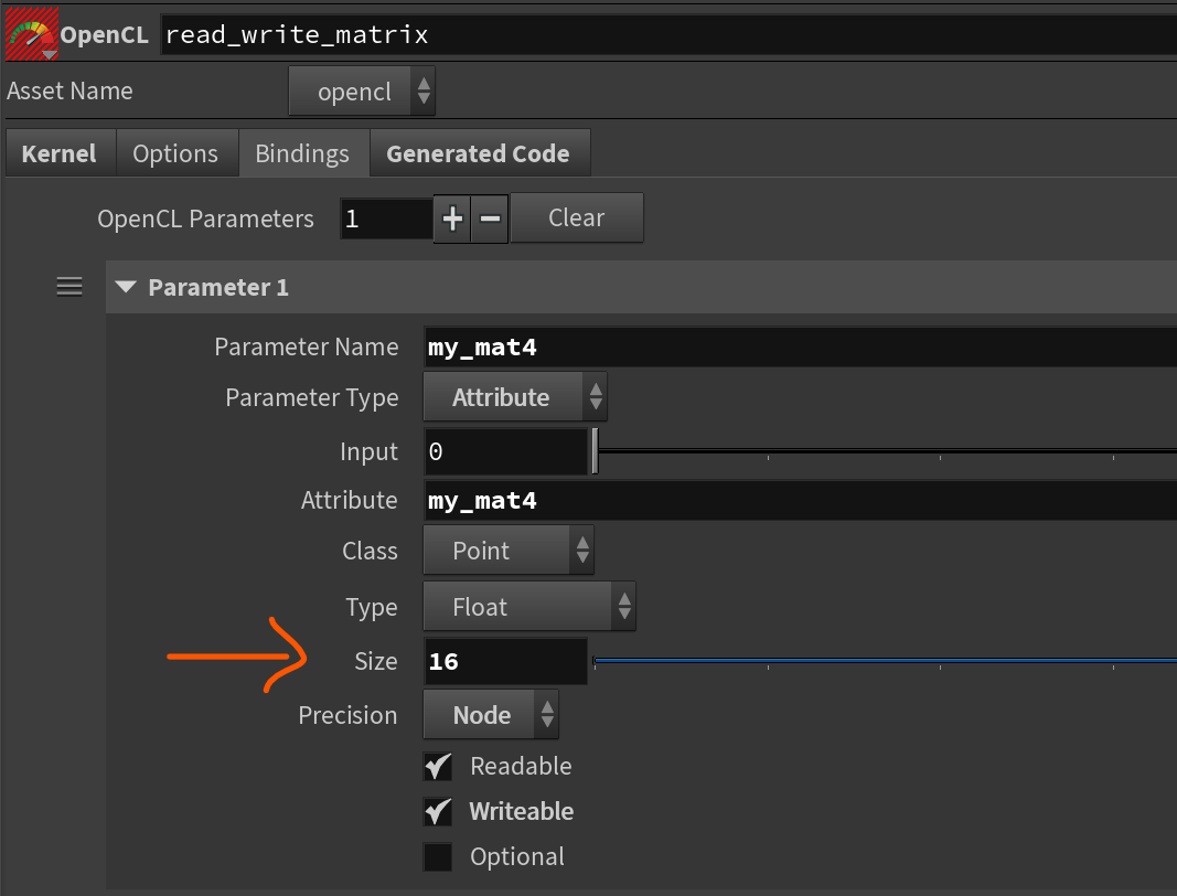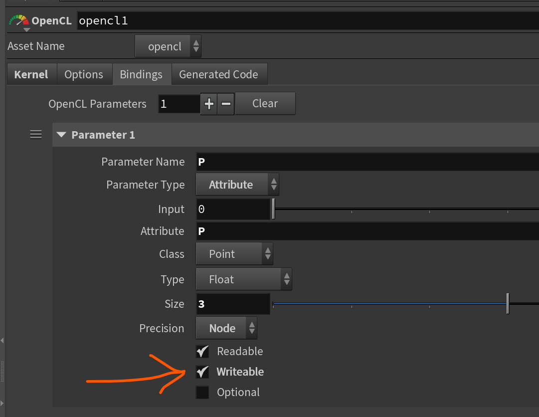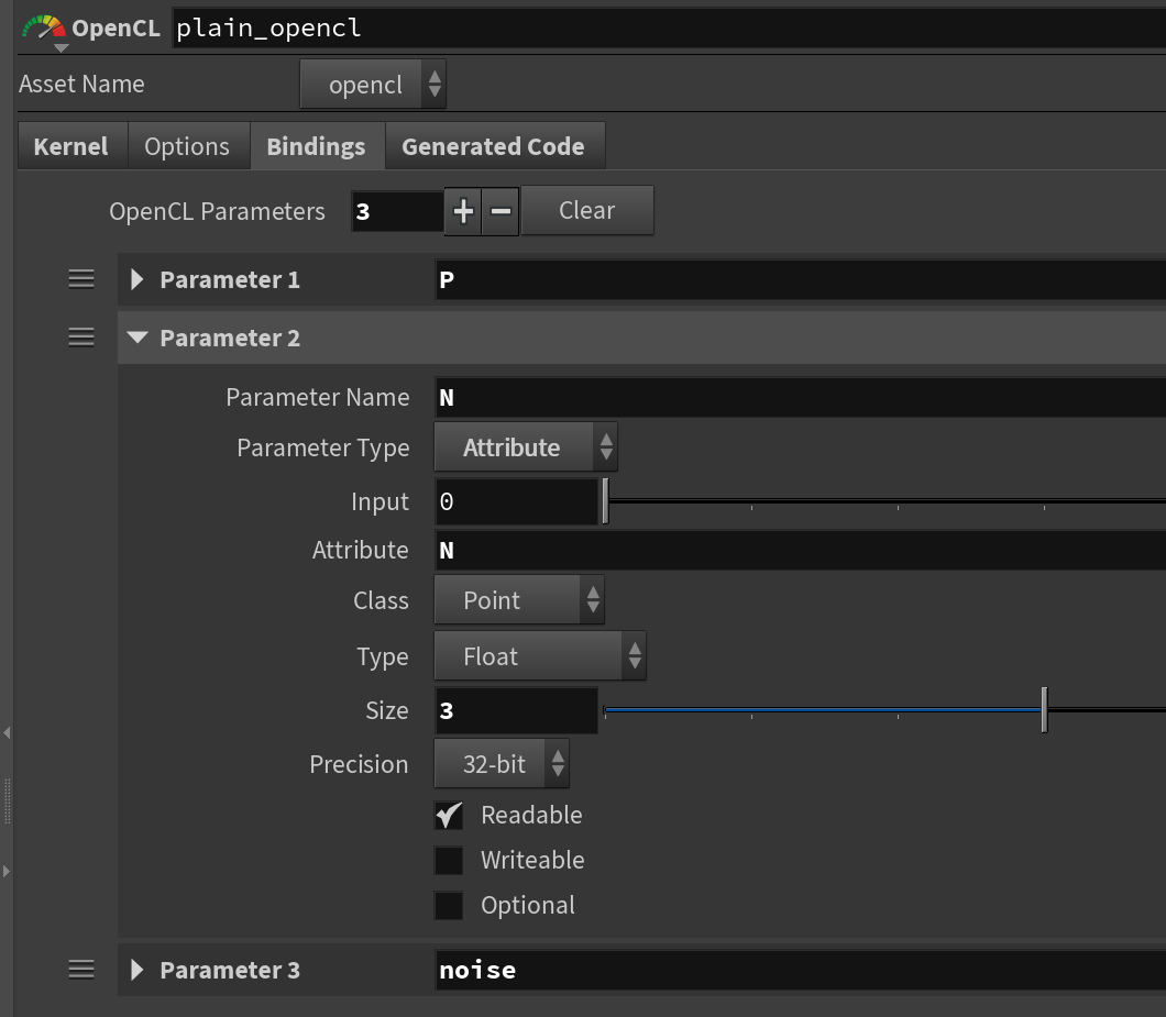 OpenCL doesn’t have this feature, we need to bind them manually. This is done in the “Bindings” tab.