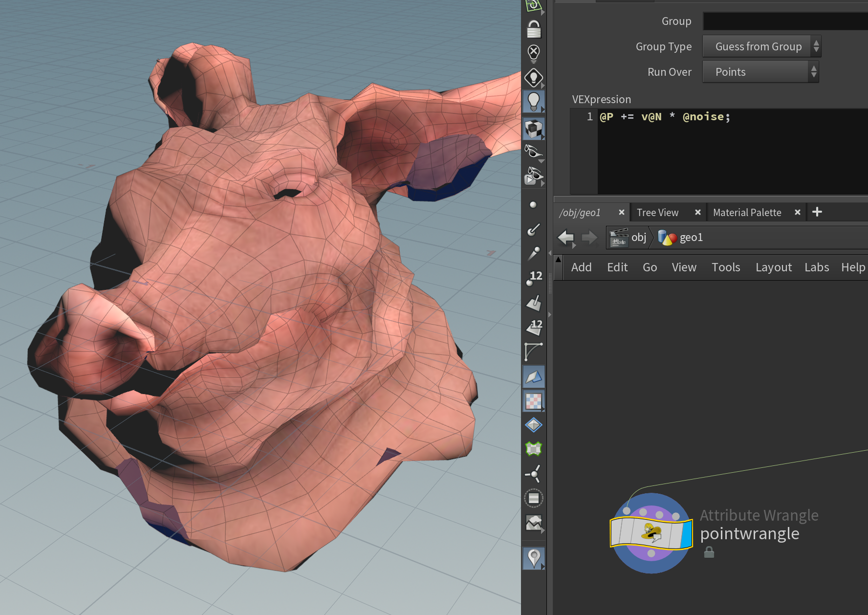 You can see it involves 3 attributes: v@P, v@N and f@noise.